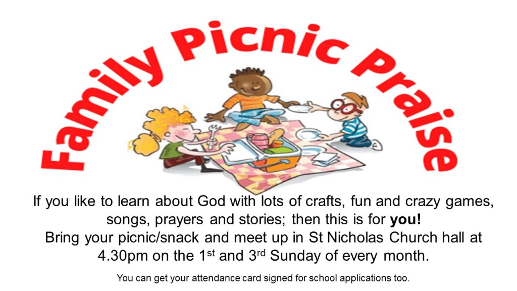 Picnic Praise – is on the 1st and 3rd Sunday of every month at 4.30pm in St. Nicholas’ Church hall.